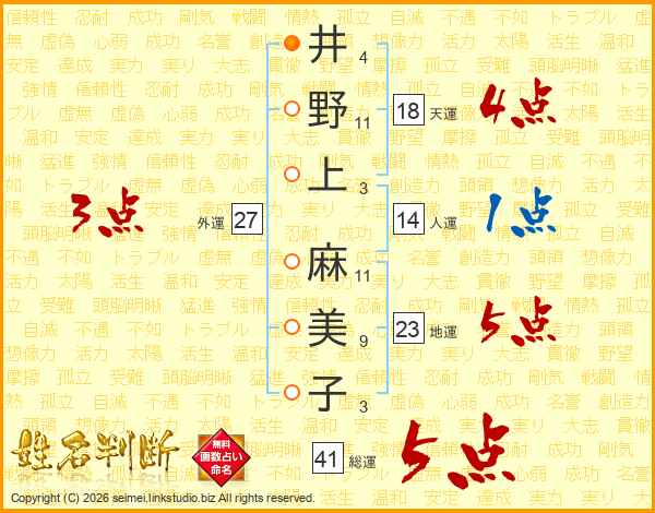 井(4画)野(11画)上(3画) 麻(11画)美(9画)子(3画)