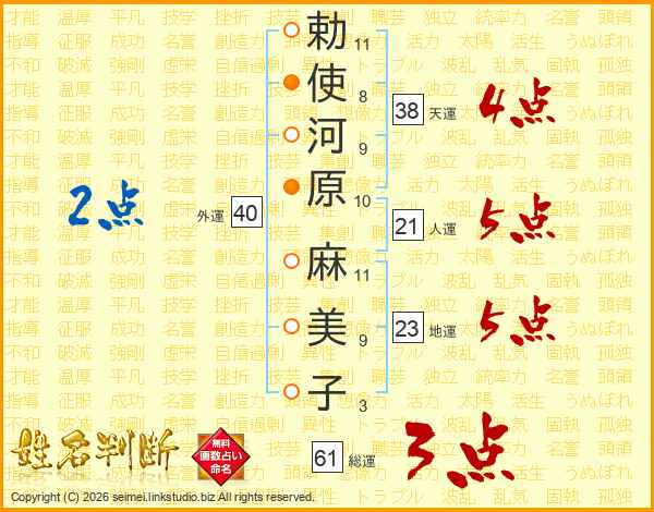 勅(11画)使(8画)河(9画)原(10画) 麻(11画)美(9画)子(3画)
