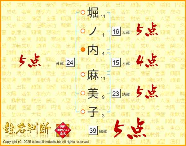 堀(11画)ノ(1画)内(4画) 麻(11画)美(9画)子(3画)