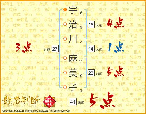 宇(6画)治(9画)川(3画) 麻(11画)美(9画)子(3画)