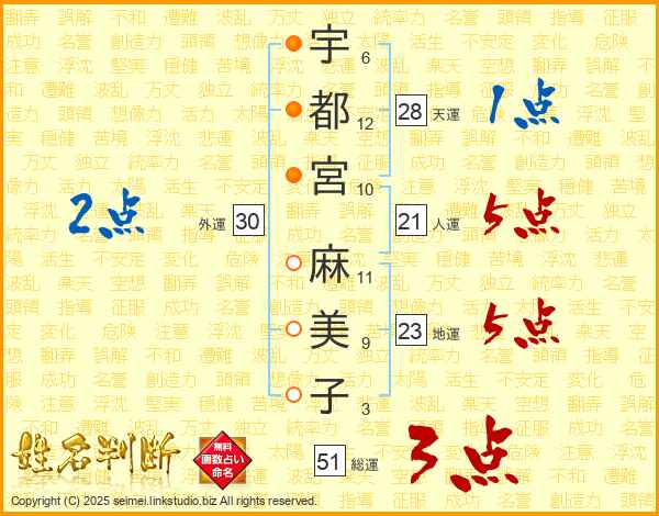 宇(6画)都(12画)宮(10画) 麻(11画)美(9画)子(3画)