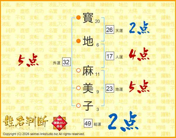 寳(20画)地(6画) 麻(11画)美(9画)子(3画)