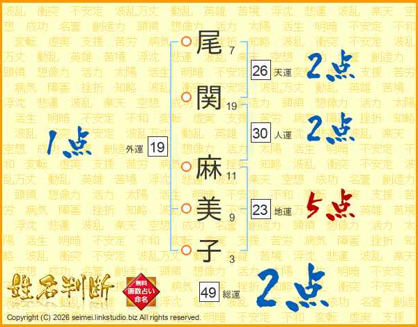 尾(7画)関(19画) 麻(11画)美(9画)子(3画)
