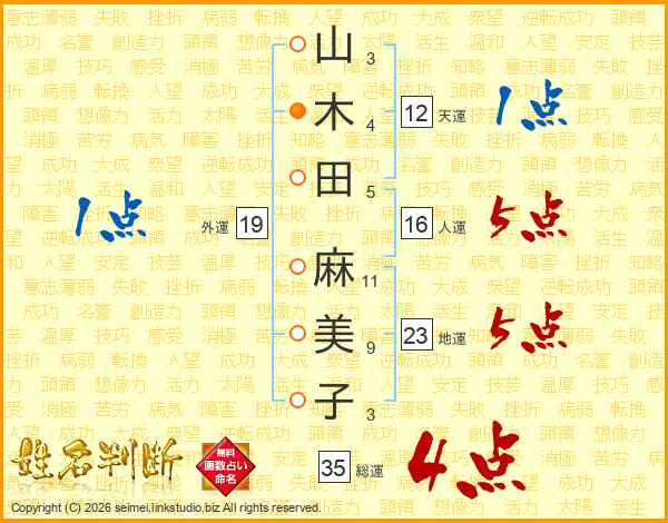 山(3画)木(4画)田(5画) 麻(11画)美(9画)子(3画)