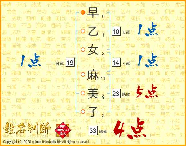 早乙女麻美子さんの総運は33画の4点!