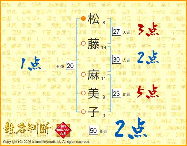 松(8画)藤(19画) 麻(11画)美(9画)子(3画)