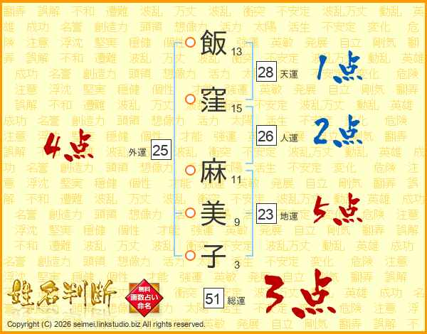 飯(13画)窪(15画) 麻(11画)美(9画)子(3画)