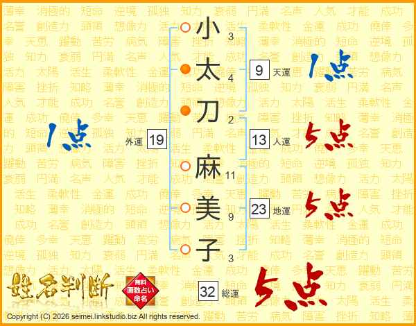 小(3画)太(4画)刀(2画) 麻(11画)美(9画)子(3画)