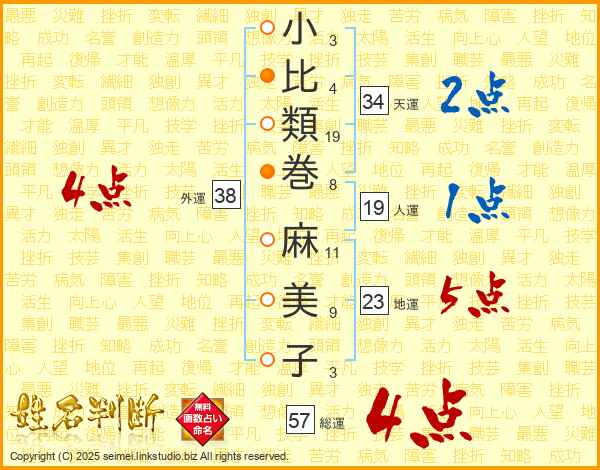 小(3画)比(4画)類(19画)巻(8画) 麻(11画)美(9画)子(3画)