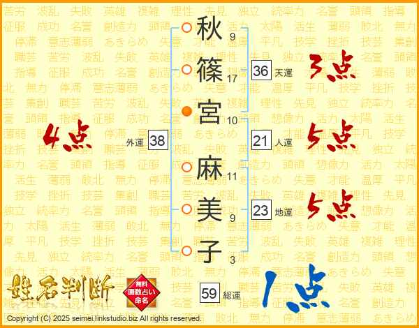 秋(9画)篠(17画)宮(10画)  麻(11画)美(9画)子(3画)