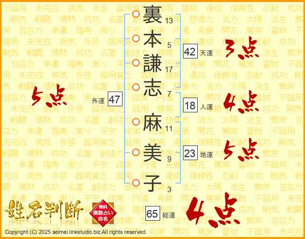 裏(13画)本(5画)謙(17画)志(7画) 麻(11画)美(9画)子(3画)