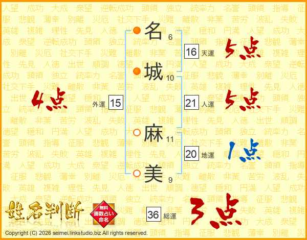 あなたの人生を表す1番重要な運勢です。生涯を通じて影響する総合運となり、主に50歳以降の晩年期に影響を及ぼします。苗字と名前の合計画数。