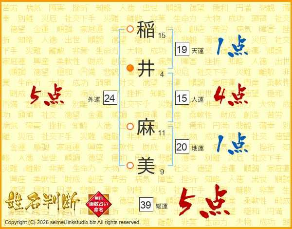 稲(15画)井(4画) 麻(11画)美(9画)