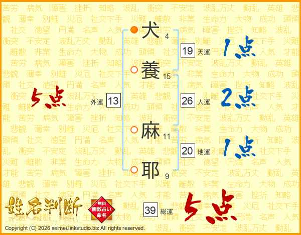 犬(4画)養(15画) 麻(11画)耶(9画)