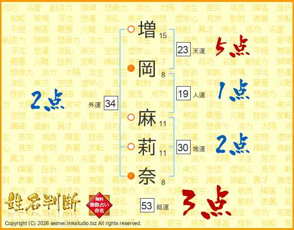 増(15画)岡(8画) 麻(11画)莉(11画)奈(8画)