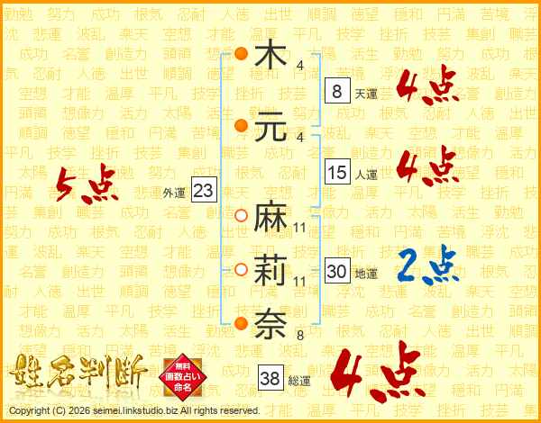 木(4画)元(4画) 麻(11画)莉(11画)奈(8画)