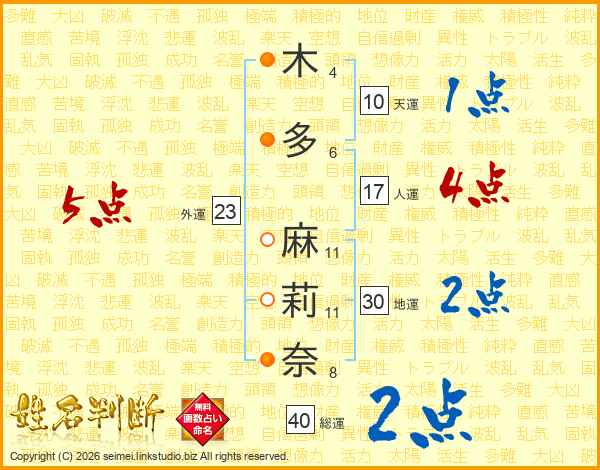 木(4画)多(6画) 麻(11画)莉(11画)奈(8画)