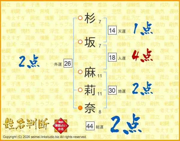 杉(7画)坂(7画) 麻(11画)莉(11画)奈(8画)
