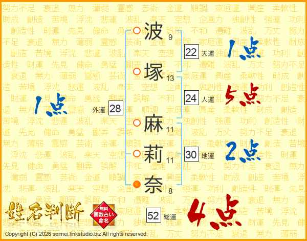 波(9画)塚(13画) 麻(11画)莉(11画)奈(8画)