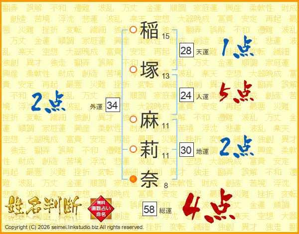 稲(15画)塚(13画) 麻(11画)莉(11画)奈(8画)