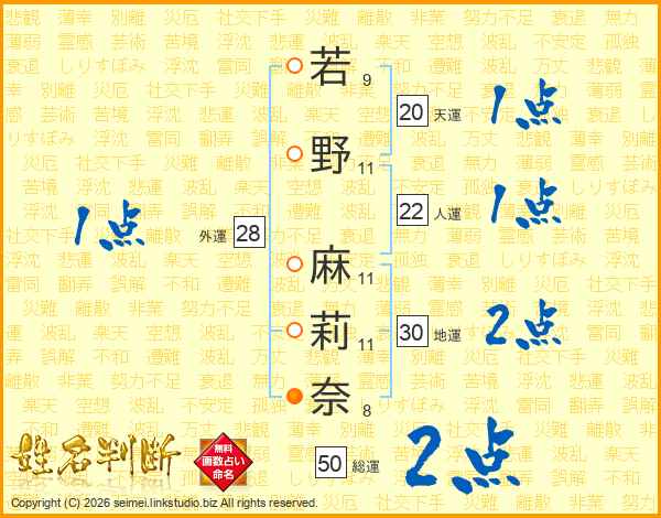 若(9画)野(11画) 麻(11画)莉(11画)奈(8画)