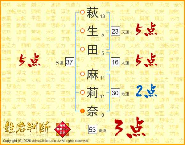 萩(13画)生(5画)田(5画) 麻(11画)莉(11画)奈(8画)