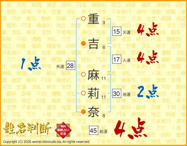重(9画)吉(6画) 麻(11画)莉(11画)奈(8画)