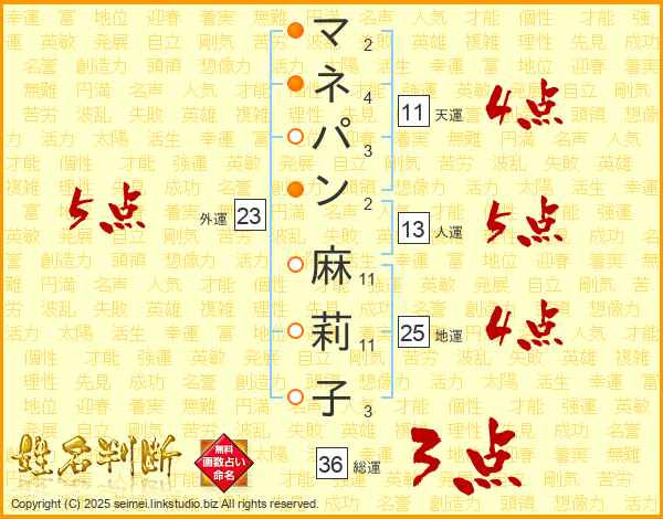 マ(2画)ネ(4画)パ(3画)ン(2画) 麻(11画)莉(11画)子(3画)