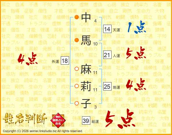 中(4画)馬(10画) 麻(11画)莉(11画)子(3画)