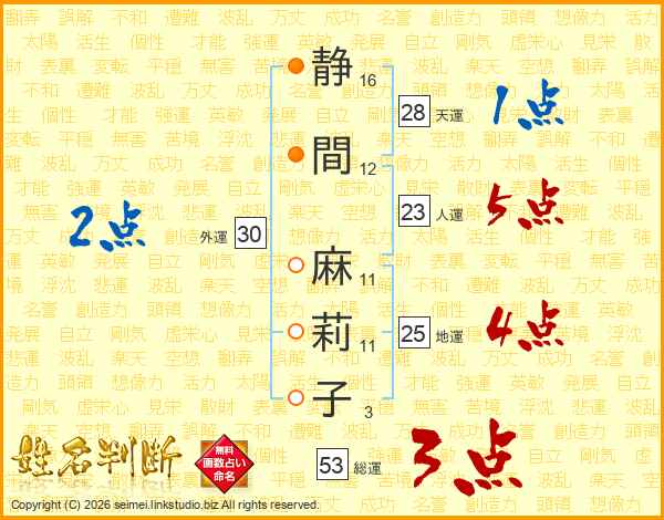 静(16画)間(12画) 麻(11画)莉(11画)子(3画)