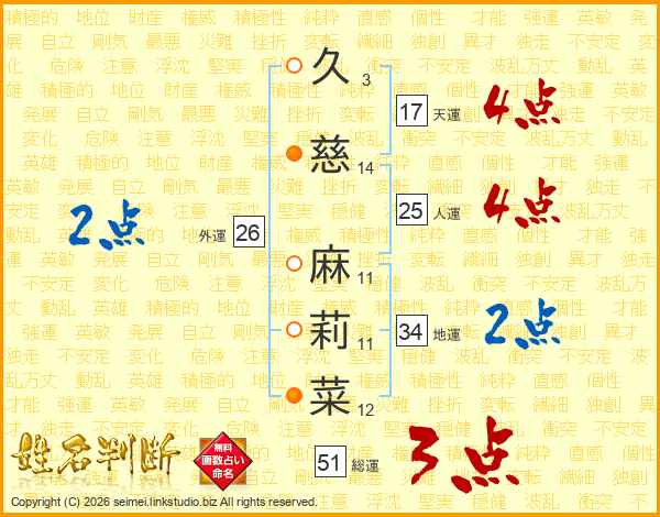 久(3画)慈(14画) 麻(11画)莉(11画)菜(12画)