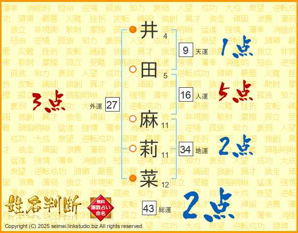 井(4画)田(5画) 麻(11画)莉(11画)菜(12画)