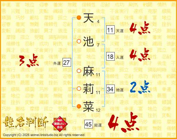天(4画)池(7画) 麻(11画)莉(11画)菜(12画)