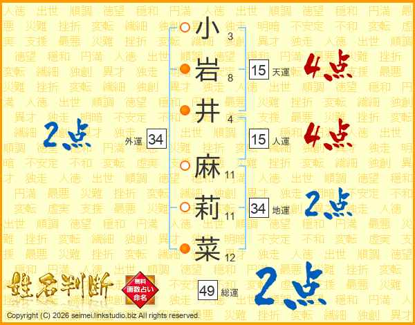 小(3画)岩(8画)井(4画) 麻(11画)莉(11画)菜(12画)