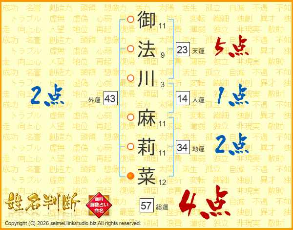 御(11画)法(9画)川(3画) 麻(11画)莉(11画)菜(12画)