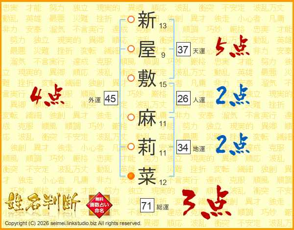 新(13画)屋(9画)敷(15画) 麻(11画)莉(11画)菜(12画)