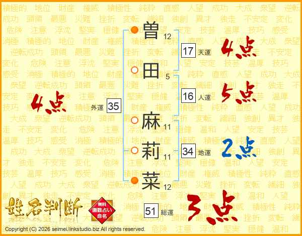 曽(12画)田(5画) 麻(11画)莉(11画)菜(12画)