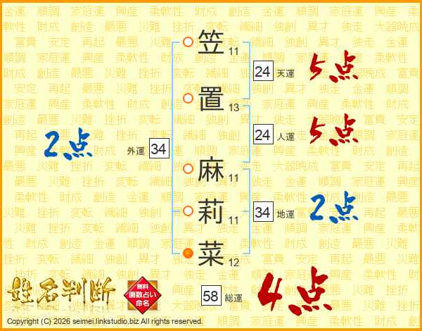 笠(11画)置(13画) 麻(11画)莉(11画)菜(12画)