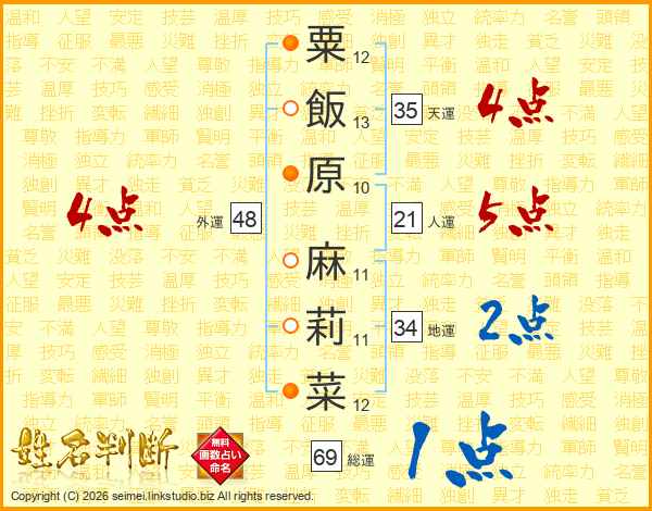粟(12画)飯(13画)原(10画) 麻(11画)莉(11画)菜(12画)