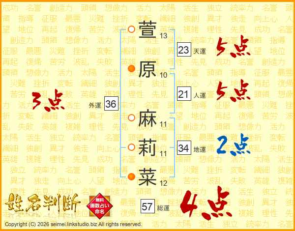萱原麻莉菜さんの総運は57画の4点!