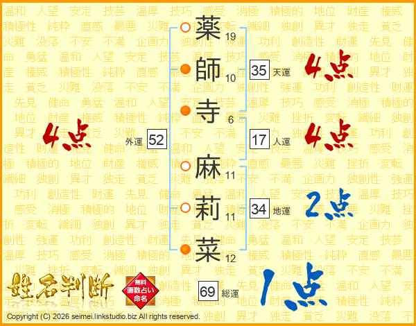 薬(19画)師(10画)寺(6画) 麻(11画)莉(11画)菜(12画)