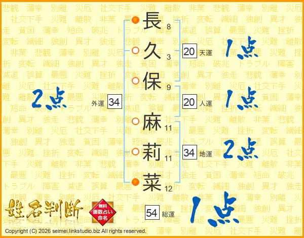 長(8画)久(3画)保(9画) 麻(11画)莉(11画)菜(12画)