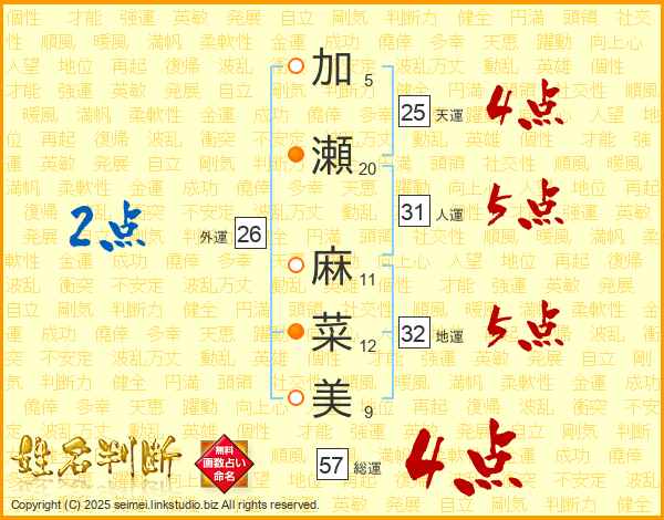 加(5画)瀬(20画) 麻(11画)菜(12画)美(9画)
