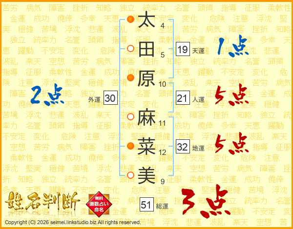 太(4画)田(5画)原(10画) 麻(11画)菜(12画)美(9画)