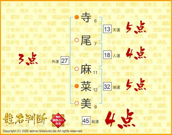 寺(6画)尾(7画) 麻(11画)菜(12画)美(9画)