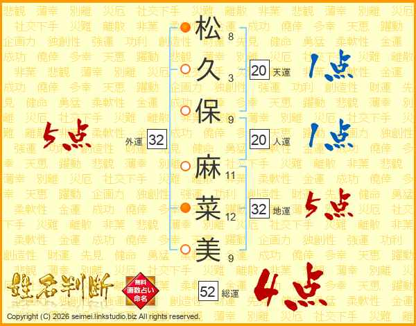 松(8画)久(3画)保(9画) 麻(11画)菜(12画)美(9画)