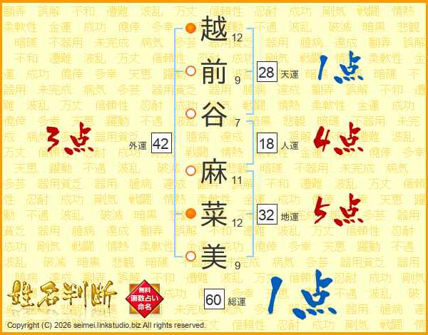 越(12画)前(9画)谷(7画) 麻(11画)菜(12画)美(9画)
