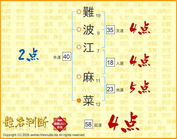 難(19画)波(9画)江(7画) 麻(11画)菜(12画)