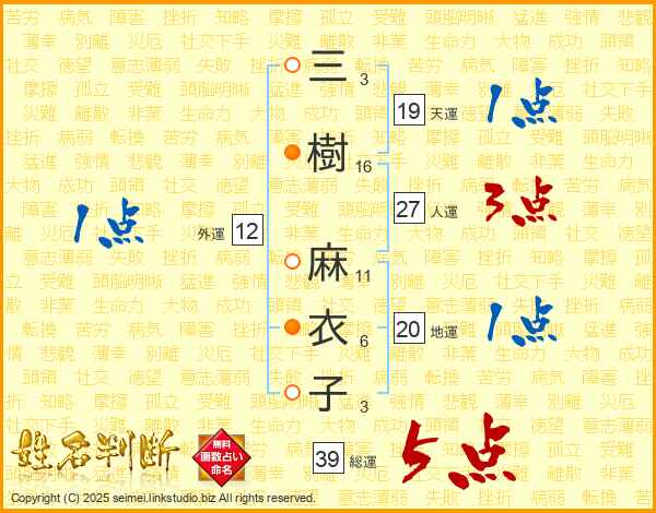 三(3画)樹(16画) 麻(11画)衣(6画)子(3画)