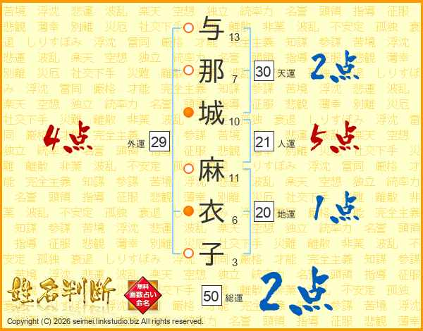 与(13画)那(7画)城(10画) 麻(11画)衣(6画)子(3画)